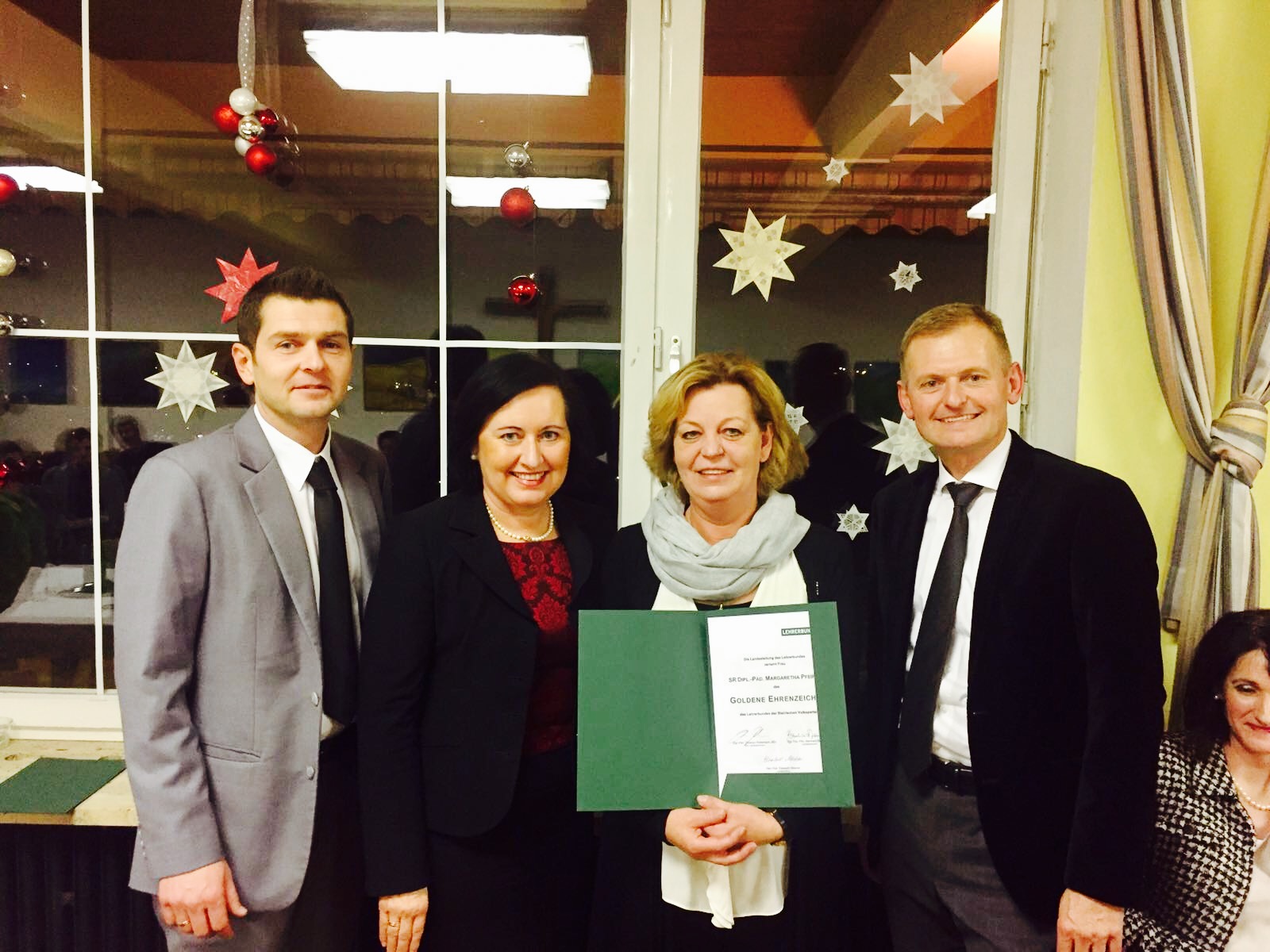 Für Ihre langjährige Tätigkeit als Vorsitzende des Dienststellenausschusses (18 Jahre) und Vorsitzende des ÖLB im Bezirk Hartberg – Fürstenfeld, Aufsichtsbereich II (13 Jahre) wurde Frau SR HOL Margarethe Pfeiffer am 13.12.2016 in Graz von Landesschulratspräsidentin Elisabeth Meixner und dem Obmann des Steirischen Lehrerbundes das goldene Ehrenzeichen verliehen.