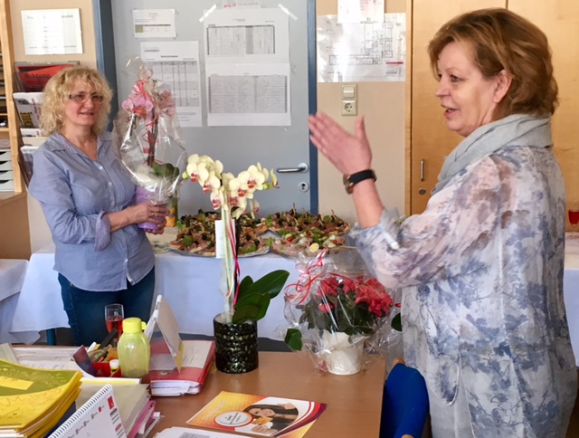 In allen Ansprachen und Dankesreden wurden ihre Kameradschaft, Freundlichkeit, Besonnenheit, Humor und unsäglich viele weitere besondere Eigenschaften als Mensch und Kollegin hervorgehoben. Neben den Ehrengästen bedankten sich Lehrerinnen und Lehrer, Schülerinnen und Schüler, Betreuungspersonen, das Team der Nachmittagsbetreuung und des Reinigungsdienstes. Der geschätzten und beliebten Schulwartin wurden alle guten Wünsche auf den Weg mitgegeben verbunden mit der Bitte, die Schule auch weiterhin so oft wie möglich zu besuchen.