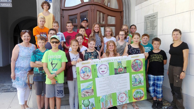 Im Rahmen des Schulfestes wurde dieses Transparent präsentiert und am Zeugnistag konnte es an unsere Försterin Frau Christine Schmiedl, als DANK für ihre umsichtige Führung im Wald überreicht werden.