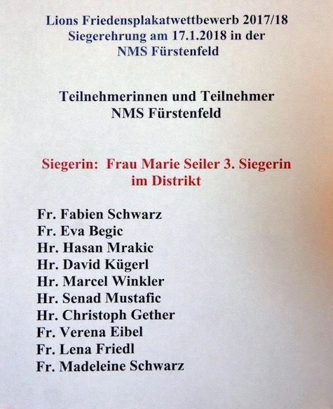 News Friedensplakatwettbewerb 2017/18 22. Januar 2018 jhafner Siegerehrung „Lions Clubs International“ Friedensplakatwettbewerb 2017/18 @ NMS Fürstenfeld. Mehr Fotos: