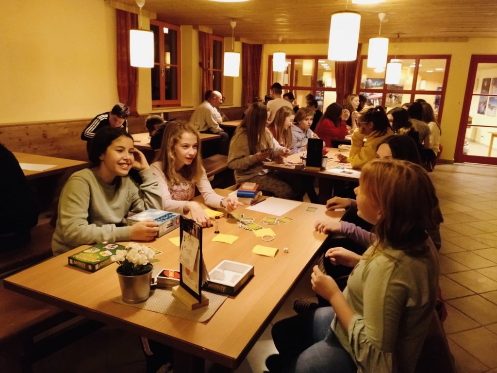 Am Abend lernten die Kinder die Pistenregeln und Erste Hilfe Maßnahmen für das Verhalten auf der Schipiste kennen. Außerdem gab es lustige Spiele, wie Werwolf, Gesellschaftsspiele, Tischfußball, Tischtennis und vieles mehr. Das Highlight der Woche war natürlich die Disco am letzten Abend, in der so richtig toll abgetanzt wurde.